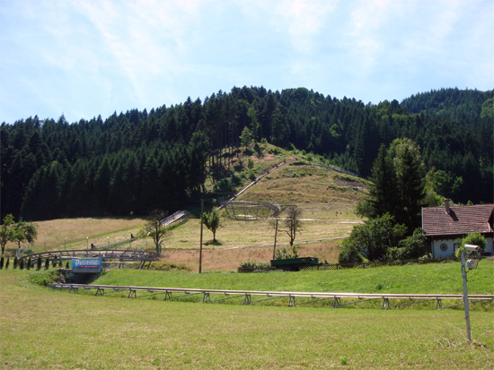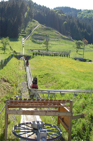 Oben angekommen klickt sich der Bob aus, und dann geht es die 1150 Meter lange Strecke nach unten. " Rodelspaß Pur !!! "